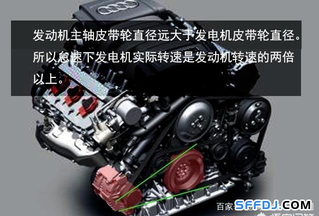 發(fā)動機(jī)輸出端通過皮帶驅(qū)動發(fā)電機(jī),而發(fā)電機(jī)的皮帶輪直徑小多了,所以怠速時(shí)發(fā)電機(jī)轉(zhuǎn)速輕松可以達(dá)到1500轉(zhuǎn)。